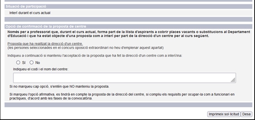 Aquesta pantalla només és per les persones interines aspirants a les OPOSICIONS ORDINÀRIES que ara participaran a les adjudicacions com a persones INTERINES i que si són seleccionades, passaran a ser funcionàries en pràctiques a dia 1 de setembre. Se’ls demana que, en cas de rebre una proposta de centre com a interina, confirmin si la volen mantenir si són seleccionades a les oposicions i passen a ser funcionàries en pràctiques a dia 1 de setembre.