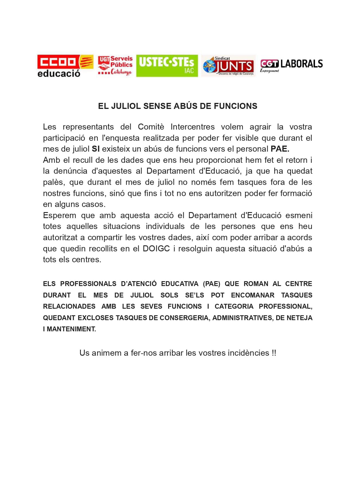 USTEC·STEs (IAC) amb la resta de membres del Comitè Intercentres hem fet arribar al Departament les dades de l’enquesta “El juliol sense abús de funcions” posant en relleu que aquest abús no és puntual sinó significatiu, i per això exigim solucions.
