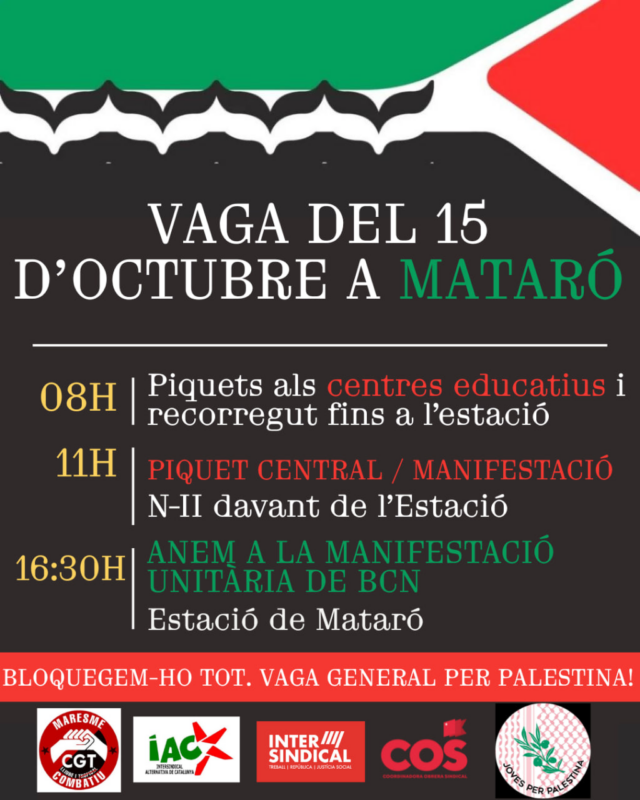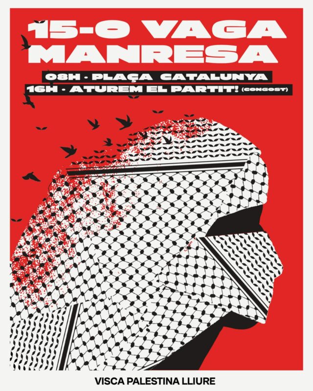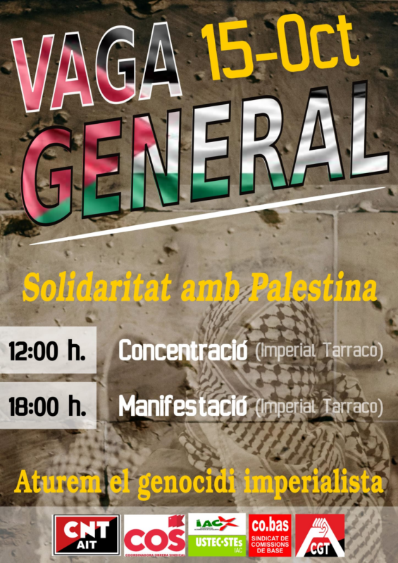 Fem una crida al conjunt de la classe treballadora a aturar-ho tot per Palestina. Reclamem que es posi fi a l’ocupació i l’apartheid del poble palestí, la retirada militar total, que es processi penalment els responsables del genocidi, que es trenquin les relacions comercials i diplomàtiques amb l’estat d’Israel, que hi hagi un embargament d’armes real i que es deixi d’augmentar el pressupost militar en detriment dels serveis públics.