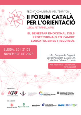 Els pròxims 20 i 21 de novembre, el II Fòrum Català per l’Orientació arrenca el seu recorregut al Campus Cappont de la Universitat de Lleida. Dues jornades centrades en l’orientació i el benestar emocional dels professionals en l’àmbit educatiu.