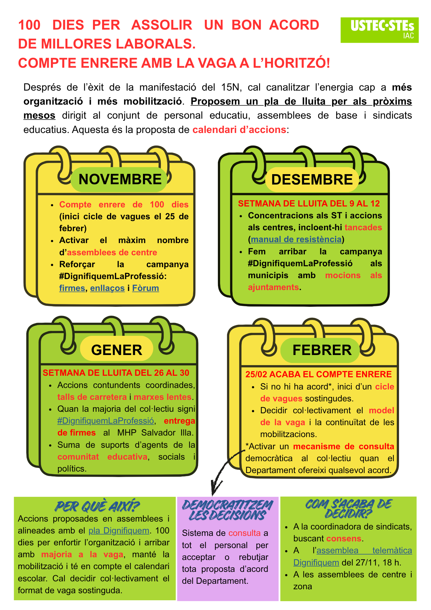 - La manifestació del #15N ha estat un èxit, però hem de ser més, cal que reforcem l’organització de base per arribar a la vaga sent la majoria del col·lectiu. Si ens hi posem, amb 100 dies ho podem aconseguir! La voluntat és aglutinar progressivament i garantir la solidesa de l’organització.