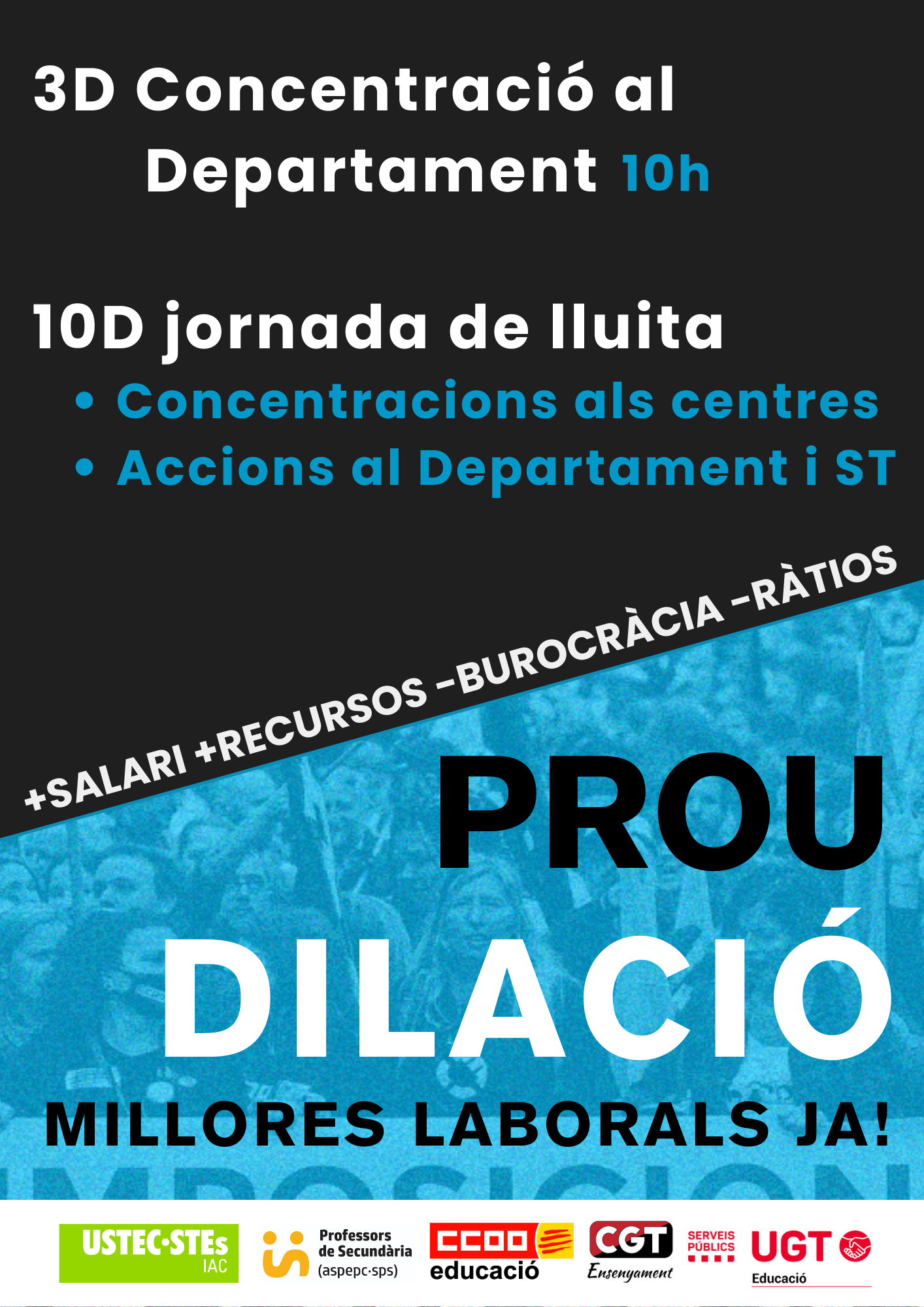 També unitàriament convoquem el 10 de desembre una jornada de lluita. Animem a tots els centres a organitzar concentracions davant del centre en algun moment del dia (abans d’entrar, al pati o a la sortida) i accions descentralitzades a Via Augusta i als diferents serveis territorials.