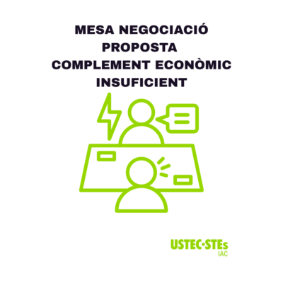 - Exigim, en la propera mesa programada per al 26 de febrer, una proposta per part del Departament d’un complement econòmic en beneficiï tot el personal laboral, lligat a la contraproposta feta per part d’USTEC·STEs (IAC) i al mandat aprovat el darrer 6 de novembre al Parlament de Catalunya.