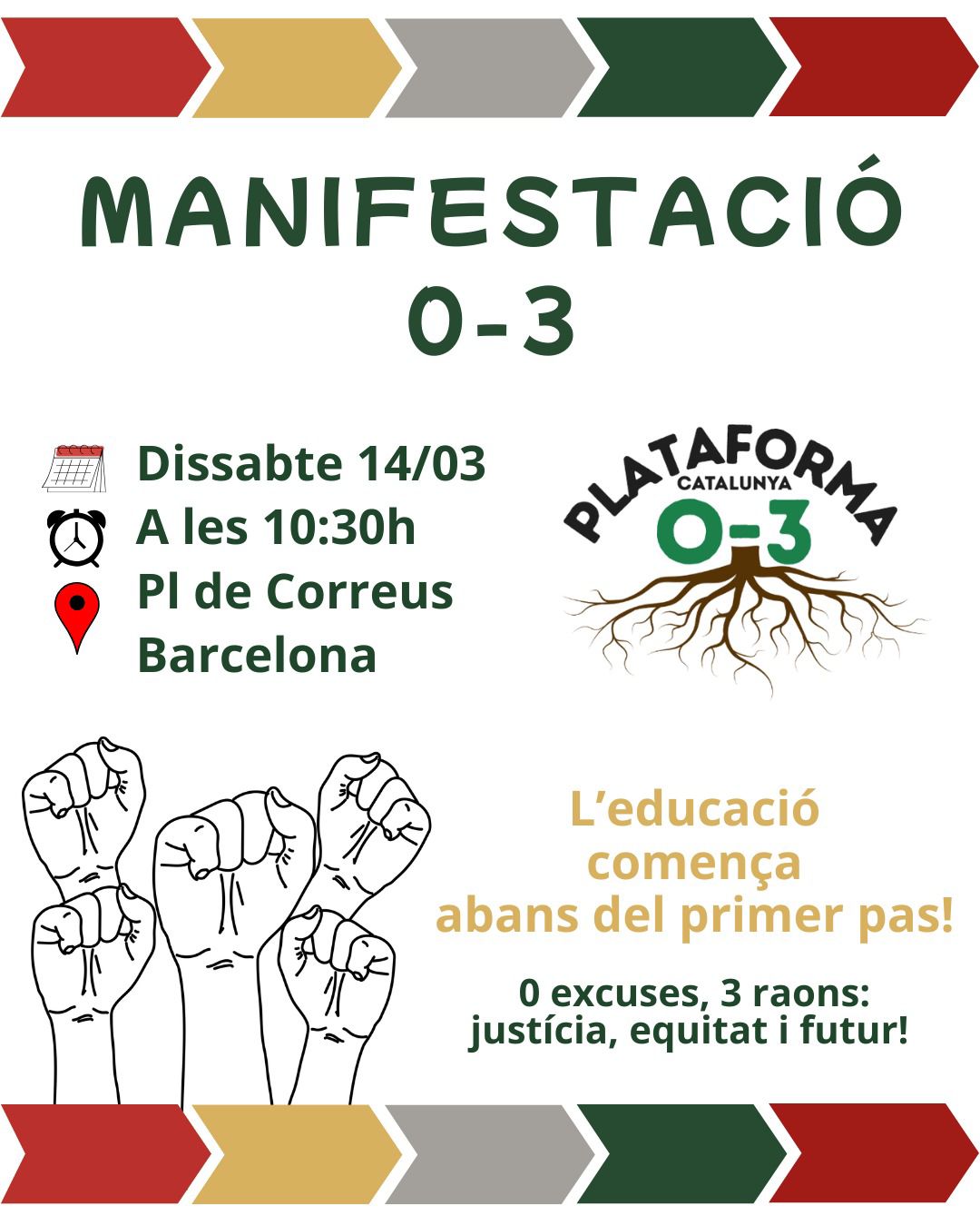 Creiem en una mobilització unitària, perquè quan el 0–3 parla amb una sola veu és més fort, més visible i impossible d’ignorar. Per això hi estan convocades famílies, professionals i comunitat: només juntes podem garantir el present i el futur de la primera infància.