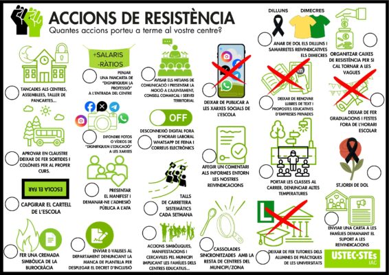 A banda del Manual de resistència que ja vam compartir al novembre, us proposem noves accions per dur a terme als centres que han anat sorgint de les assemblees de centre, de zona i de les trobades Dignifiquem la professió:Ja s’estan impulsant diverses iniciatives en aquest sentit arreu del territori com al Penedès o la proposta de no fer sortides i colònies.