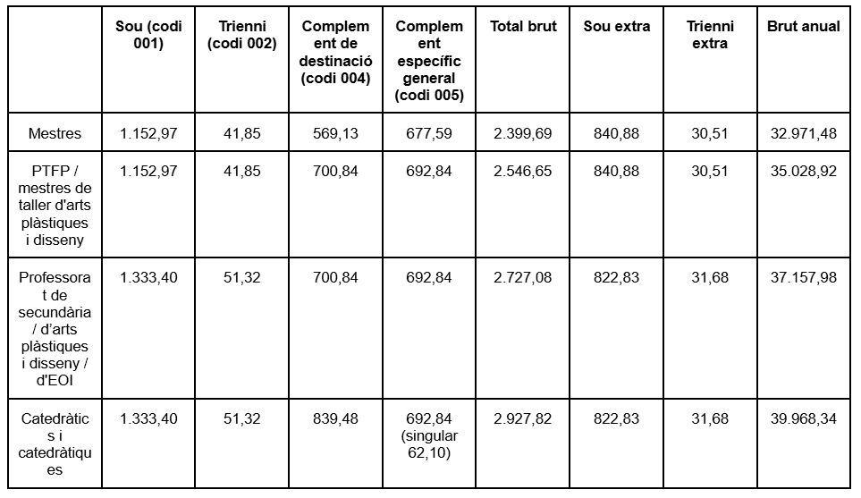 – Grup A1: professorat d’ensenyaments secundaris, professorat d’arts plàstiques i disseny, professorat d’EOI i cos d’inspecció.