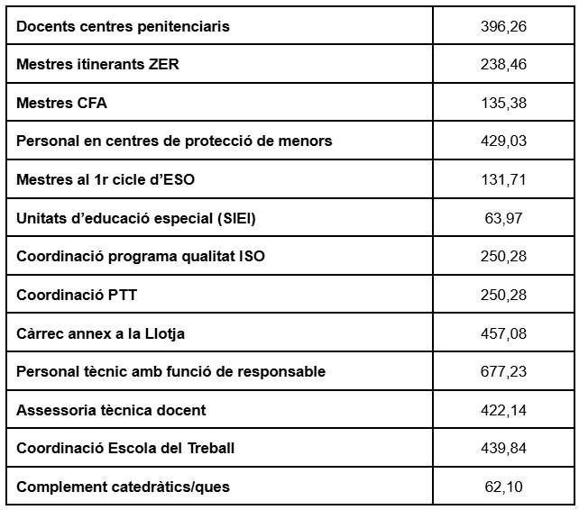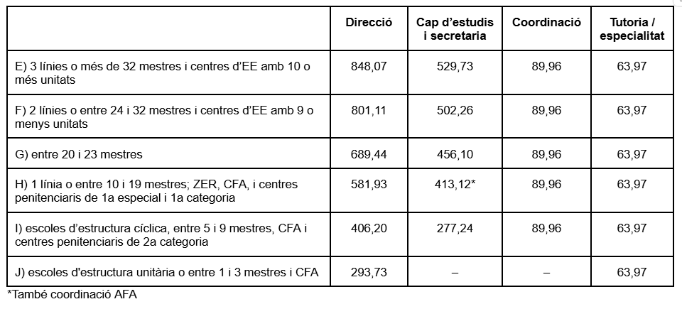 - Complements per càrrecs a escoles d’educació infantil i primària, centres d’educació especial, zones escolars rurals, centres de formació de persones adultes i centres penitenciaris:
