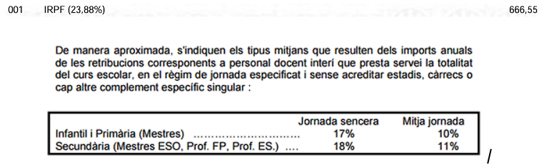 001 IRPF: El càlcul de l’IRPF pot canviar al llarg de l’any en funció de l’evolució en les retribucions. És normal que en els darrers mesos de l’any s’apugi la retenció de l’IRPF sobtadament (30%, 40%…) perquè s’hagi de fer una regulació en funció dels ingressos i deduccions de tot l’any.